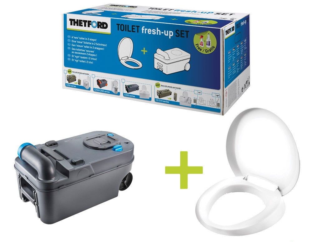 En enkel og økonomisk måte å gjøre et brukt kassette-toalett så godt som nytt! Perfekt når du kjøper en brukt campingvogn eller bobil! Settet består av en avfallstank med toalettsete og lokk. Passer venstre side. Alle Thetford Fresh-Up Set er med hjul og håndtak!